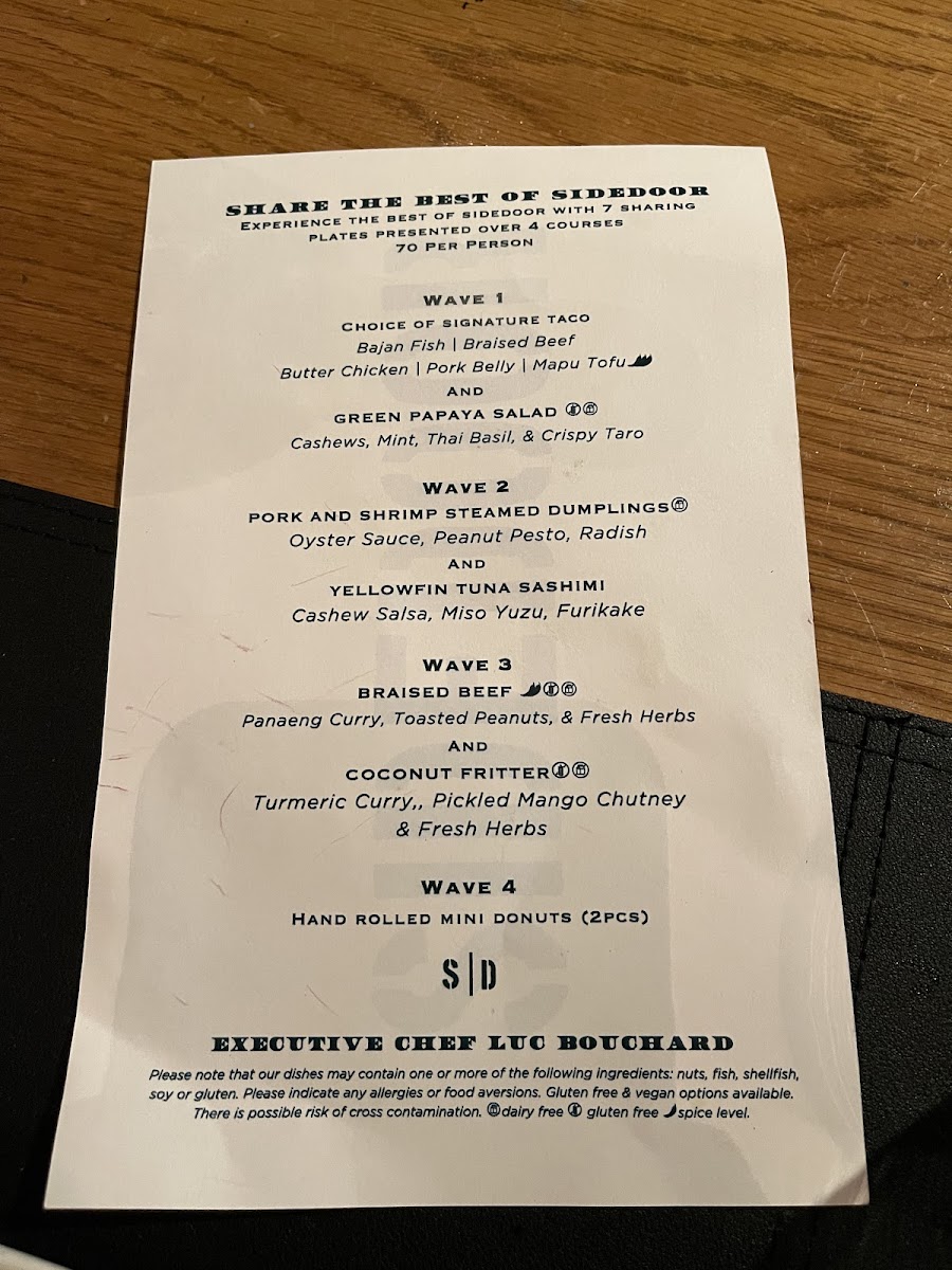 Welcome to Sidedoor, a vibrant culinary gem nestled at 18b York St, Ottawa. This delightful eatery specializes in a unique fusion of flavors, serving an enticing selection of tacos that highlight the restaurant's creative flair. Standouts include the Bajan Fish Tempura and the Braised Lamb with Limeleaf Crème Fraîche.
